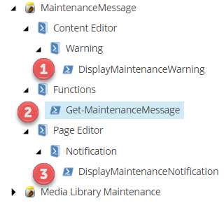 Script DisplayMaintenanceNotification is responsible for displaying the maintenance message in Experience Editor. Like in a previous case you have to import shared function that will provide a message.