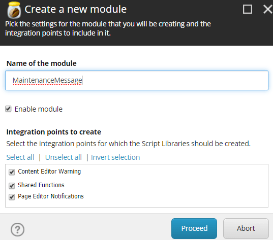 The first two options will ensure integration with Content Editor and Experience Editor. Option Shared Functions creates a Function folder where you will add functions common to both notifications. Below you can see a new module structure. Now you have to add three scripts: